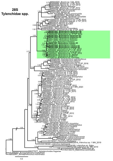 While analyzing published data on Boleodorus species, we found that some Boleodorus species were inadequately described, requiring synonymization or further detailed studies to retain valid taxa status. In our work, we do not propose any taxonomical revisions, rather we list all the important characters that one should consider while performing Boleodorus identification. Moreover, we agree with several nematologists [2,52,80] that such actions should only be performed after recollection of type material and conducting a detailed molecular study using ribosomal and mitochondrial markers [81]. Like other Tylenchidae nematodes, the current sequence-based data for Boleodorus species are insufficient. Very few Boleodorus sequences are present in NCBI for comparative and phylogenetic studies; most of the sequences consist of unidentified Boleodorus species. In our phylogenetic analyses, none of the Boleodorus species held a doubtful position, consequently allowing us to conclude that Boleodorus species may be monophyletic. However, it is prudent to consider that only a small portion of Boleodorus species have been discovered or are available for sequence-based study; the phylogenetic positioning will likely change in the future.