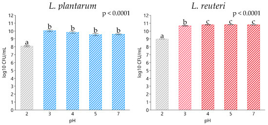 Acid resistance assay from pH 2 to 7 for L. plantarum and L. reuteri. Data are expressed as least square means (LSMEANS) and standard errors (SE). a,b,c Means with different superscript letters indicate statistically significant differences (p < 0.05).