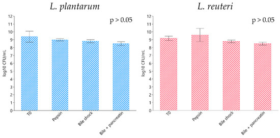 The results related to acid tolerance showed that both L. plantarum and L. reuteri tolerate pH levels above 2 without losing significant viability. In line with our study, Yun et al. [44] demonstrated that L. plantarum and L. reuteri were able to resist pH levels from 4 to 9, meanwhile at pH 2, both strains showed a similar survival reduction (20%) after 6 h of incubation. Lukacova et al. [45] reported that more than 90% of L. plantarum strains need to survive at pH 3 in order to act as probiotics.