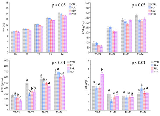 Zootechnical performance of control (CTRL) and treatment groups (PLA, REU and P+R) measured over 28 days of experimental trial. Data are expressed as least square means (LSMEANS) and standard errors of the means (SE); a,b Means with different superscripts are significantly different among treatments (p < 0.01); Presented p-values indicate statistically significances of pairwise comparisons; BW: body weight; ADG: average daily gain; ADFI: average daily feed intake; FRC: feed conversion ratio; CTRL: control group; PLA: treatment group supplemented with 2 × 108 CFU/g of L. plantarum; REU: treatment group supplemented with 2 × 108 CFU/g of L. reuteri; P+R: treatment group supplemented with 2 × 108 CFU/g of L. plantarum and L. reuteri (1:1 w/w).
