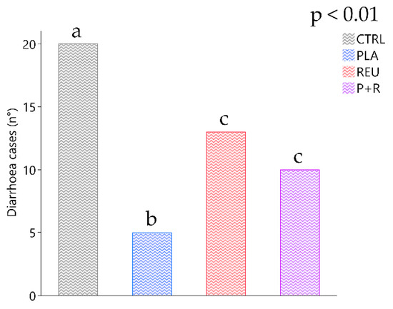 Total diarrhoea cases recorded during the 28-day trial for the control (CTRL) and treatment groups (PLA, REU and P+R). Data are expressed as the sum of recorded cases of diarrhoea, considering a faecal score ≥ 2 diarrhoea; a,b,c Means with different superscripts are significantly different among treatments (p < 0.01). CTRL: control group; PLA: treatment group supplemented with 2 × 108 CFU/g of L. plantarum; REU: treatment group supplemented with 2 × 108 CFU/g of L. reuteri; P+R: treatment group supplemented with 2 × 108 CFU/g of L. plantarum and L. reuteri (1:1, w/w).