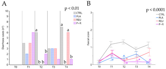 Number of diarrhoea cases recorded (A) and average faecal scores (B) during the 28-day trial for the control (CTRL) and treatment groups (PLA, REU and P+R). (A) Data are expressed as the sum of the recorded cases of diarrhoea, considering faecal score ≥ 2 diarrhoea; a,b Means with different superscripts are significantly different among treatments (p < 0.01). (B) Data are expressed as least square means (LSMEANS) and standard errors (SE); * Means with asterisks are significantly different from the control group (CTRL, p < 0.0001). CTRL: control group; PLA: treatment group supplemented with 2 × 108 CFU/g of L. plantarum; REU: treatment group supplemented with 2 × 108 CFU/g of L. reuteri; P+R: treatment group supplemented with 2 × 108 CFU/g of L. plantarum and L. reuteri (1:1, w/w).