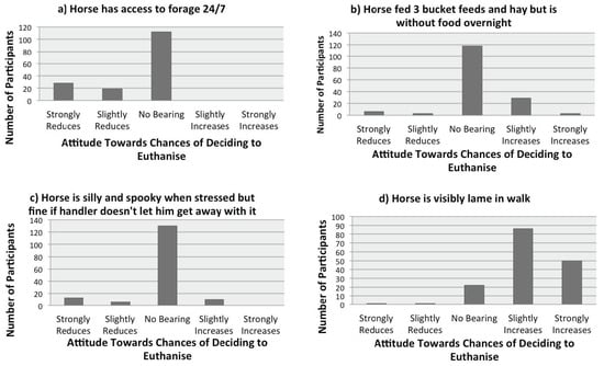 The scenarios for participants to consider were then listed in random order: Participants were asked to state on a Likert-type scale whether they considered each scenario to strongly increase, slightly increase, slightly decrease or strongly decrease the likelihood that they would decide to euthanise the horse in each case. A neutral “would have no bearing on the decision” option was also included. A final free-text question was added, asking whether the participant had previously made a decision to euthanise a horse and, if so, for what reason.