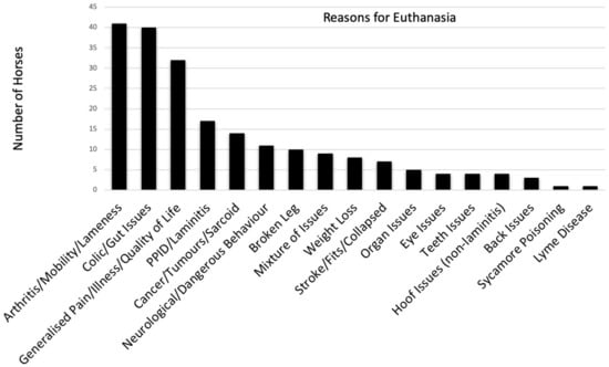 Figures were plotted using Microsoft Excel. Responses to the single, qualitative question about reasons for euthaniasia were clustered manually by generalised theme, such as lameness, dental issues or dangerous behaviour.