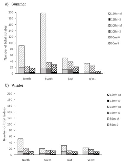 It can be clearly observed that the number of isolates was higher in the summer (575) than in the winter (245), and also that the number of isolates decreased with distance from the farm in all cardinal directions. In this sense, the counts were especially high in summer at 50 m south, coinciding with the position of the fans (south side of the buildings), which are often activated at this time. However, this effect was not observed in the counts conducted in winter, which is attributable to the lower activity of the fans in that season. The farm is located on a flat terrain, with no slopes or nearby forest masses. The wind direction changed during sampling periods, and it was not very strong on the days when the sampling was carried out (maximum 10 km/h, both in summer and winter sampling).