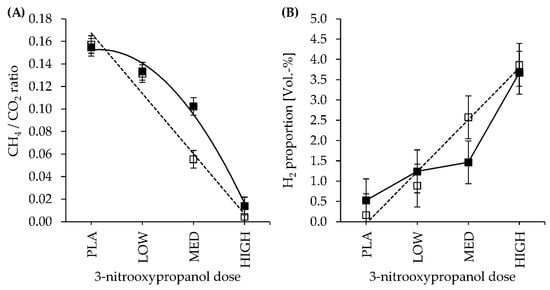 Effect of 3-nitrooxypropanol dose (PLA: 0, LOW: 73, MED: 160, and HIGH: 1200 mg of 3-NOP/kg of feed DM) and low- (□, dashed line) or high- (■, solid line) concentrate proportion in the incubated diet on (A) methane (CH4) to carbon dioxide (CO2) ratio and (B) hydrogen (H2) proportion (Vol.-%) in fermentation gases; curve fitting according to (non)significant L and Q effects (Table 3).
