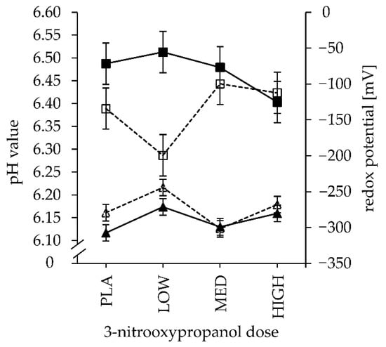 Effect of 3-nitrooxypropanol dose (PLA: 0, LOW: 73, MED: 160, and HIGH: 1200 mg of 3-NOP/kg of feed DM) and low- (□,△, dashed line) or high- (■,▲, solid line) concentrate proportion in the incubated diet on pH values (■,□) and redox potential (▲,△) in fermenter fluid; curve fitting according to (non)significant L and Q effects (see Table 4).