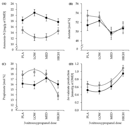 Effect of 3-nitrooxypropanol dose (PLA: 0, LOW: 73, MED: 160, and HIGH: 1200 mg of 3-NOP/kg of feed DM) and low- (□, dashed line) or high- (■, solid line) concentrate proportion in the incubated diet on (A) ammonia-N production (mg/g of dry matter degradation (DMD)), (B) acetate (mol %), (C) propionate (mol %), and (D) iso-valerate production (mmol/g of DMD) measured in the effluent; curve fitting according to (non)significant L and Q effects (see Table 4).
