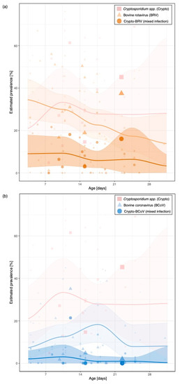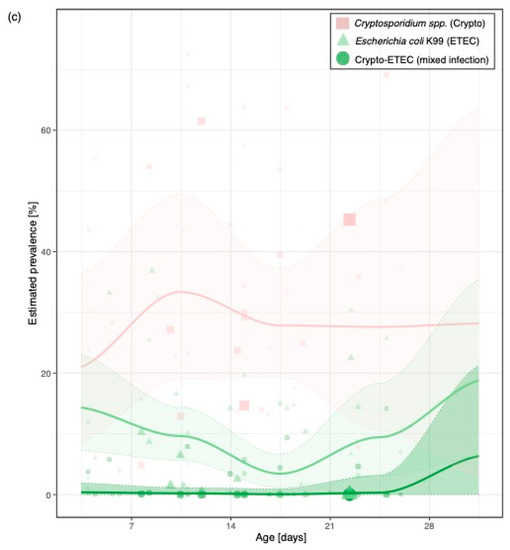 Figure 3 shows the prevalence of Crypto and associated mixed infections with BRV, BCoV, and ETEC (Figure 3a–c) depending on the age of sampled animals until 30 days. While the courses of the Crypto-BRV and Crypto-BCoV mixed infection are similar and the peak in prevalence of both occurs between 7 and 14 days of animal age (Crypto-BRV: 9.3%, CI: 3.4–17.1; Crypto-BCoV: 3.0%; CI: 0.0–8.7), the course differs from that of the Crypto-ETEC mixed infection, where the highest prevalence occurs after 28 days of animal age (Crypto-ETEC: 6.3%, CI: 0.0–21.2 (see Figure 3 and Tables S1–S4)).