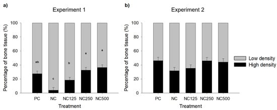 Proportion of low-density (HU values ranging from 141–500) and high-density (HU values above 500) tissues with respect to total bone (HU > 140) in left Os metacarpale IV bone of piglets as measured by computed tomography in (a) Experiment 1 and (b) Experiment 2. NC = negative control; NC125 = NC diet with phytase at 125 FTU/kg feed; NC250 = NC diet with phytase at 250 FTU/kg feed; NC500 = NC diet with phytase at 500 FTU/kg feed. Values in the table are LSMEANS of one animal per pen (8 pens per treatment) for each experiment. Bars with different letters differ significantly at p < 0.05 (LSD test). Significant linear and quadratic responses to phytase dose addition to the NC diet were observed in Experiment 1 (p < 0.001 and p = 0.016, respectively).