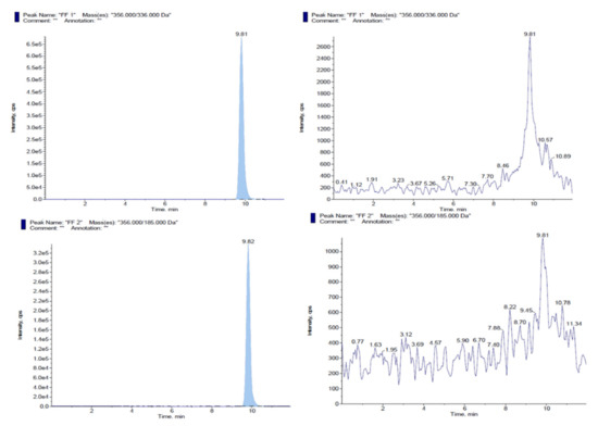 Chromatograms resulting from florfenicol standard solutions injection (left), as well as from the subsequent injection of a mobile phase solution (right). At the top ion fragment mass Q1 (356.00/336.00) and in the bottom ion fragment mass Q3 (356.00/185.00).
