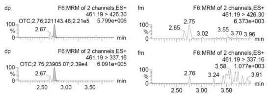 As for recovery ratios, the calibration curves for this parameter were calculated in triplicate, using five equidistant points of OTC at concentrations of 5, 10, 20, 30, 40, and 50 µg/kg. Similarly, florfenicol curves were calculated also in triplicate, using concentrations of 20, 40, 60, 80, and 100 µg/kg. An internal standard was added to all analysed samples at a concentration of 1 µg/kg of metacycline or 4 µg/kg of chloramphenicol D5, respectively. Then, the standard recovery for each sample was calculated and the values observed were corrected according to the recovery observed for the internal standard.