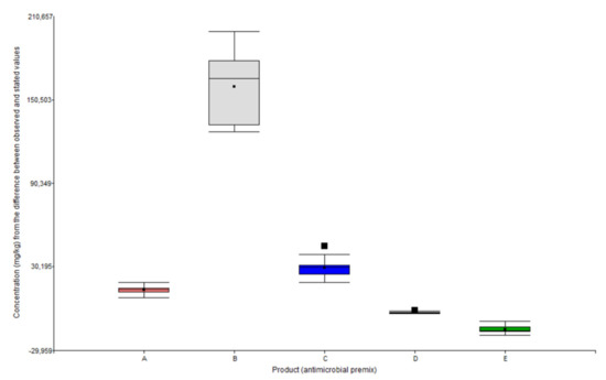 The concentrations observed (mg/kg) in the samples (n = 20) from each premix were corrected by the recovery of the analytical method, and the comparison with the information stated on each product label has been detailed on Table 5. Additionally, Figure 3 shows box plots of each measurement batch in regard to concentration differences quantified (in mg/kg) v/s the values stated for each premix.