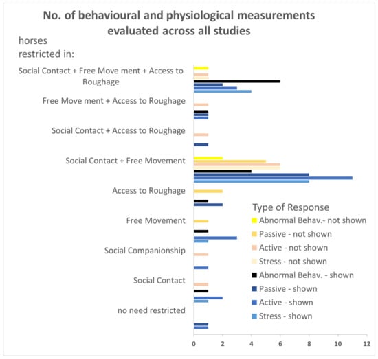 As only very few studies succeeded in isolating the effects of restrictions in just one of the four proposed basic needs of social contact, social companionship, free movement and access to roughage, a clear statement on whether animals can generally cope with the particular restrictions remains elusive. However, there were sufficient studies on combined restrictions in social contact, free movement and access to roughage, and when the horses’ environments were restricted in these three conditions, they appeared to suffer, as ‘Abnormal Behaviour’ and ‘Passive Response’ had clearly developed. This is consistent with the finding that abnormal behaviour display may be caused by a variety factors (e.g., genetics, rearing conditions, housing and feeding []).