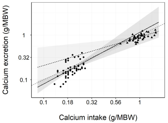 Linear regression between dietary calcium (Ca) intake and fecal Ca excretion (g/kg bodyweight (BW)0.75; metabolic bodyweight (MBW)). The 95% confidence regions for both diet groups surround the y = x (-------) equivalence line. The control (n = 56; —●—) and test (n = 50; ---▲---) display as distinct clusters supporting the view that Ca excretion is in proportion to dietary Ca intake.