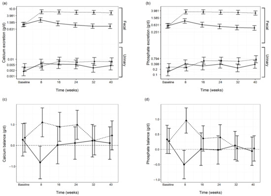 Apparent digestibility of Ca (Control 19.75 (−13.16, 52.66) %; Test 23.94 (−5.50, 53.37) %; p = 1.000) and P (Control 31.66 (14.69, 48.64) %; (Test 24.29 (9.11, 39.48) %; p = 0.991) were not significantly different between diet groups at the baseline. With the exception of a between diet group difference in apparent Ca digestibility at week 8 due to a significant (p < 0.001) decline in the control group, no other significant differences from the baseline or between diet group were determined. A significant (p < 0.001) between diet group difference in apparent P digestibility was determined at week 8 due to a significant (p < 0.001) decline in the control group. Significant (p < 0.05) changes from the baseline were found in both diet groups at other time points, however, no other significant differences between diet groups were determined (Table S4).