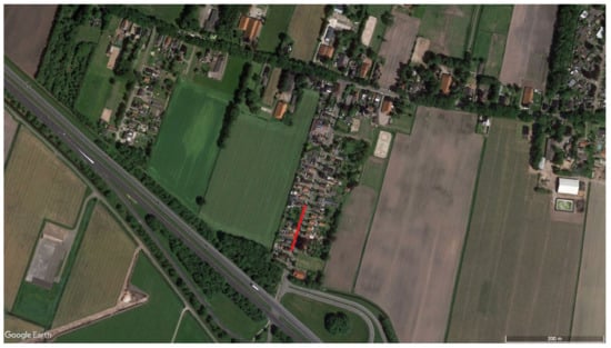 Satellite image overviewing the village Kolham and the trajectory (in red) from south to north of wolf 1 when filmed. Image: ©Google Earth.