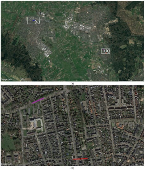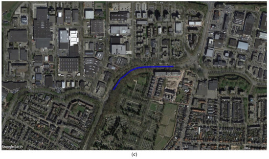 Satellite image overview (a) of the subsequent east to west video-recorded locations of wolf 6 in one night: (b) in red and pink in Bennekom; (c) in blue in Veenendaal. Images: ©Google Earth.