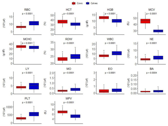 The measured hematologic parameters of 210 pregnant Hanwoo cows and 70 Hanwoo calves (from within 6 h of birth to 28 weeks, a total of 700 samples) were compared. There were significant differences in the results of cows and calves for all 14 parameters (Figure 1).