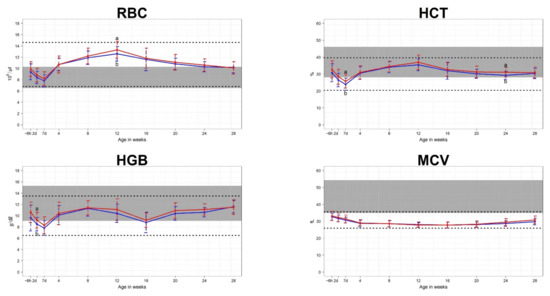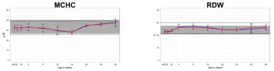 Means and standard deviations for erythrocyte parameters in 70 Hanwoo calves (35 male and 35 female). The blue line represents the mean for male calves, and the red line represents the mean for female calves. The shaded areas show the reference intervals for Hanwoo cows. The areas between the lower and upper dashed lines represent the reference intervals of Hanwoo calves. The x-axis displays the sampling ages, where ~6h is within 6 h of birth, 2d is 2 days after birth, 7d is 7 days after birth, and the numbers 4–28 correspond to the number of weeks after birth. a,b: Indication that mean values within the same age are significantly different (p < 0.05).