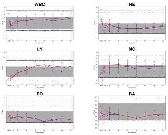 Means and standard deviations values for leukocyte parameters in 70 Hanwoo calves (35 male and 35 female). The blue line represents the mean for male calves, and the red line represents the mean for female calves. The shaded areas show the reference intervals for Hanwoo cows. The areas between the lower and upper dashed lines represent the reference intervals of Hanwoo calves. The x-axis displays the sampling ages, where ~6h is within 6 h of birth, 2d is 2 days after birth, 7d is 7 days after birth, and the numbers 4–28 correspond to the number of weeks after birth. a,b: Indication that mean values within the same age are significantly different (p < 0.05).