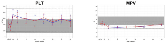 The mean platelet counts decreased by the second day after birth, increased rapidly until the seventh day, and gradually decreased into the cows’ reference interval until 28 weeks. This pattern is similar to that found in a previous study [8]. The mean MPV decreased until 4 weeks after birth and then was maintained below the cows’ reference interval from 4 weeks to 28 weeks of life. The result that the MPV of calves is lower than that of cows has been reported in previous studies [21]