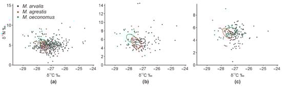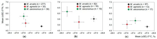 | M. arvalis | −27.08 ± 0.04 | −28.58–−24.58 | 4.00 | 4.93 ± 0.08 | 0.52–14.50 | 13.98 |