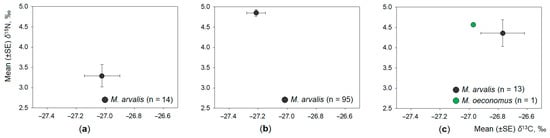 | M. oeconomus | −27.59 ± 0.11 | −28.88–−26.37 | 2.51 | 5.77 ± 0.25 | 2.16–9.01 | 6.85 |