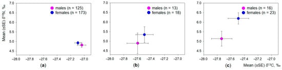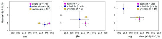 - Intraspecific differences of the stable isotope distribution are absent, with no differences in average carbon and nitrogen stable isotope values in males and females and between the age groups of the same species.
