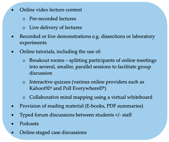 A non-exhaustive list of options for delivering theoretical content online. Kahoot!©-Tordenskiolds gate 6, 0160 Oslo, Norway. https://kahoot.com (accessed on 17 June 2021). Poll Everywhere Inc©-639 Howard Street, San Francisco, CA 94105 USA. https://polleverywhere.com (accessed on 17 June 2021).