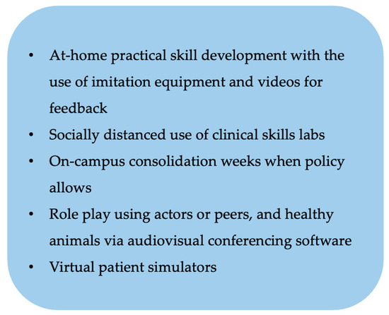 Given the proximity required between clinical instructors and students for the supervision of practical tasks involving real patients, in-person clinical teaching may be downgraded to being purely observational. However, the veterinary profession is fortunate that, unlike medical colleagues, veterinary work does not strictly require close human contact to practice many technical skills and so there is still scope for some practical skill acquisition. For obvious reasons, practical skills are difficult to teach remotely, and some creativity will be required to facilitate this. Several options are suggested in Figure 3. Suture kits have been made available for students to take home and practice at University of Wisconsin School of Veterinary Medicine [23]. Students can also video themselves and submit them to the faculty. Other schools are planning for practical consolidation weeks when students return, to consolidate the theory that they are currently learning [16].