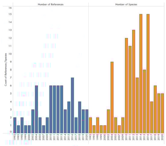The high number of bird references (Figure 2) could be attributed to their popularity within the legal and illegal pet trade and thus more available standardized testing methods. Given the small dataset, it is difficult to draw significant conclusions from any single specific taxa or year.