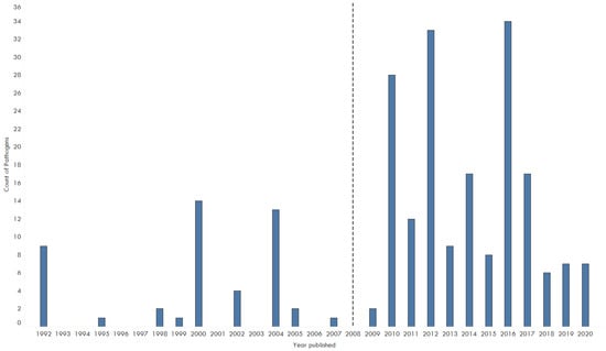 The lack of continuity in monitoring and surveillance limits this review’s analysis about the diversity of pathogens found. However, analyzing the number of pathogens collectively, reporting increased over time with over 34 pathogens reported in 2016 (Figure 3). The majority of papers examined pathogens from one category (Table 1). Five papers included multiple pathogen categories [32,44,50,54,63].