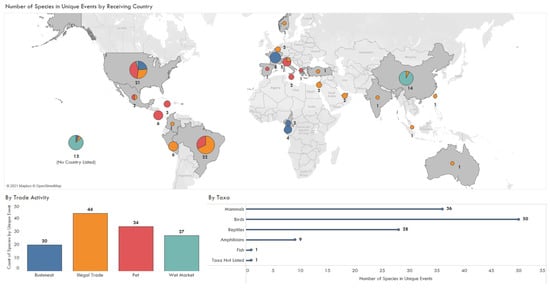 Number of species by taxa and unique trade events including bushmeat, pet trade, wet markets, and other illegal trade, summarized by country of import, 1990–2020.
