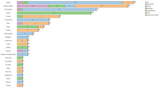 The type of illegal trade activity was not evenly distributed geographically and hotspots of activity which involved certain taxa varied. Brazil (22), China (14), and the USA (21) received the most species with zoonotic pathogens totaling 50 bird species, 36 mammals, 28 reptiles, nine amphibians and one fish (Figure 4). The single No Taxa Listed refers to an unspecified shipment of bushmeat. The most common documented activity was illegal trade through travel (44), followed by the pet trade (34), wet markets (27) and bushmeat (20). There were 14 events with unspecified locations. The US, France, Gabon, and Cameroon received bushmeat (Figure 4) and the seizures examined were primarily mammals. Wet market events primarily occurred in China involving reptile species (Figure 5). Pet trade occurred in the USA (9) and Brazil (7) with a few instances in Europe, specifically Spain, Italy, and Greece (Figure 4).