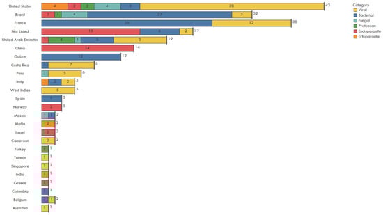 The USA (43), France (38), Brazil (32), United Arab Emirates (19), and China (14) imported the greatest number of pathogens through IWT according to the evaluated publications (Figure 6). A total of 23 imported pathogens did not list country of importation. Note, stating these as the highest importers only indicates they have recorded the most through published papers. Few studies report testing of illegal shipments (Figure 1) and this may not encompass the full landscape of true pathogen spillover by country, but rather a focus by researchers on certain countries throughout the case study window.