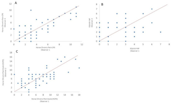 The Horse Chronic Pain CPS (HCP CPS) had a good inter-observer correlation (ICC = 0.84, Confidence Interval (CI): 0.74–0.91) that was statistically significant (p < 0.001) (Figure 1A). In contrast, EQUUS-FAP had a statistically significant poor inter-observer correlation (ICC = 0.45 (CI: 0.058–0.67, p < 0.05, Figure 1B), while the combined Horse Chronic Pain Scale (HCPS) had good agreement between observers (ICC = 0.78, CI: 0.62–0.87) that was statistically significant (p < 0.001, Figure 1C).