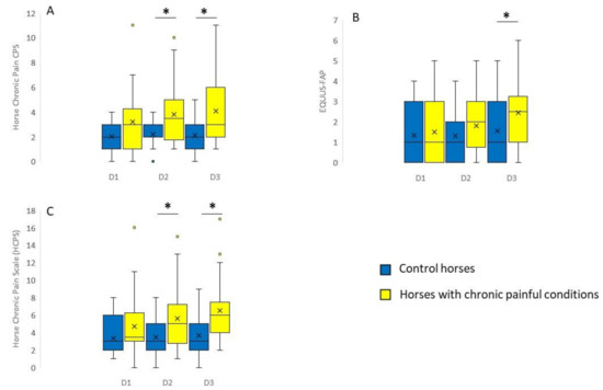 Composite and facial expression-based pain scales in horses with chronically painful conditions and healthy control animals. (A) Horse Chronic Pain Composite Pain Scale (HCP CPS). (B) Equine Utrecht University Scale for Facial Assessment of Pain (EQUUS-FAP). (C) Horse Chronic Pain Scale (HCPS; combination of HCP CPS and EQUUS-FAP). D1, Day 1; D2, Day 2; D3, Day 3. Boxes show 25–75 percentiles, with the horizontal line being the median and the x being the mean score; whiskers show 5–95 percentiles; open dots show outliers. * p < 0.05 (n = 27 control animals; n = 26 horses with chronic painful conditions).