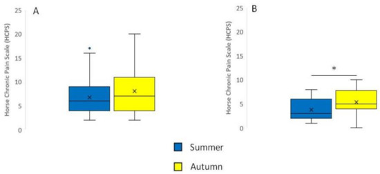 Patients and control animals during summer and autumn observations. (A) horses with chronic painful conditions during summer and autumn observations (p = 0.20, n = 15). (B) healthy pain-free control horses during summer and autumn observations. Boxes show 25–75 percentiles, with the horizontal line being the median and the x being the mean score; whiskers show 5–95 percentiles; open dots show outliers (* p < 0.05, n = 16).