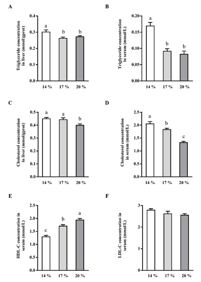 Effect of dietary crude protein level on the concentrations of triglyceride and cholesterol in liver and serum. Triglyceride concentration in liver (A) and serum (B). Cholesterol concentration in liver (C) and serum (D). HDL-C (E) and LDL-C (F) concentration in serum. Values are means ± SEMs, n = 6. Means without a common letter differ, p < 0.05. HDL-C, high-density lipoprotein cholesterol; LDL-C, low-density lipoprotein cholesterol.