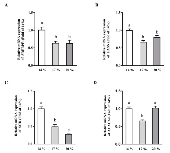 mRNA expression of SREBPF1 and the downstream of its targets, such as FASN, ACACα, and SCD were determined. As shown in Figure 2, 17% or 20% dietary CP downregulated the mRNA expression of SREBPF1 (Figure 2A), FASN (Figure 2B) and SCD (Figure 2C) when compared with those of piglet administered with 14% CP (p < 0.05). Consistently, 17% CP dramatically reduced the mRNA expression of ACACα (Figure 2D) when compared with 14% CP group (p < 0.05). However, no difference was observed between 14% CP and 20% CP group (p > 0.05). Taken together, our results showed that dietary CP regulated the master genes expression which involved in hepatic lipogenesis and downstream targets genes.