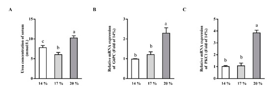 The concentrations of urea in serum (Figure 4A), as a major metabolic endpoint product of amino acids, were reduced (p < 0.05) in the 17% CP group when compared with the 14% CP group. However, 20% dietary CP enhanced (p < 0.05) the urea concentration in serum when compared with those of piglets fed with 14% or 17% CP diet (Figure 4A). To further understand the mechanism of dietary CP on liver lipid metabolism, mRNA expression of G6PC and PKC1 involved in gluconeogenesis were determined. mRNA expression of G6PC (Figure 4B) and PKC1 (Figure 4C) were upregulated in 20% CP group when compared with the 14% or 17% CP group (p < 0.05). However, no differences were observed in the mRNA expression of G6PC and PKC1 between the 14% and 17% CP groups (p > 0.05).