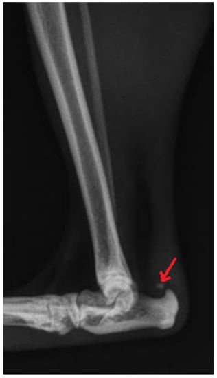 According to Morgan et al. [], OCD of the tarsocrural joint is present when a radiographic examination shows a defect in the trochlear bone outline in any view, the presence of free bone fragments in the joint, and a periosteal reaction of the distal part of the tibia with modeling of the articular surface. Van der Peijl et al. [] proposed the following criteria for the assessment of OCD lesions in radiographs: location and size of OCD lesions, the presence of mineralized cartilage flaps or joint mice, and the dimensions of osteophytes in millimeters at the caudal, cranial and medial edges of the joint. Other authors also reported extension of the articular space, joint effusion, swelling of the soft tissues around the joint, fragmentation of medial malleolus or fibular lateral malleolus, radiolucent areas in trochlear ridges, the formation of enthesiophytes and sclerosis of subchondral bone [,,,,,,].