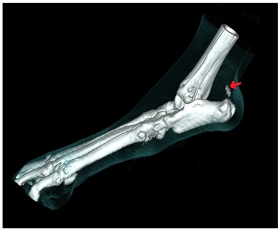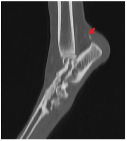 Computed tomography is better than radiography in detecting small bone fragments, and it is more reliable in imaging displacements within the fracture [,]. It often allows for a correct diagnosis and the planning of surgical treatment. Butler et al. [] found that the sensitivity of computed tomography was subjectively higher (77% versus 57%, respectively) compared to radiographic examination in ten projections. According to the authors, the sensitivity of fracture detection was subjectively higher for each bone in computed tomography, and small chipping fractures of the central tarsal bone were detectable only with this imaging technique. Nevertheless, false positive results were noted more frequently in CT examination than in radiography []. These results are consistent with those obtained by Hercock et al. []. According to Hercock et al., the use of computed tomography for fracture evaluation and classification improved the observer’s ability to correctly assess fractures [].