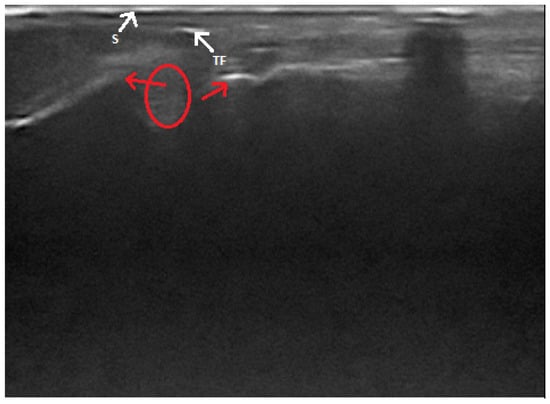 Ultrasonographic image of total Achilles tendon rupture. Ends of the torn tendon (red arrows), a hematoma (circle), a fragment of a tendon (TF) and the skin surface (S) is shown.