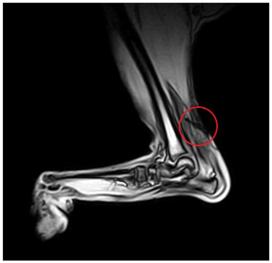 Magnetic resonance imaging allows for the visualization of tendons and adjacent soft tissue structures in high resolution, multiplanar images (Figure 5). A case report by Lin et al. [] is the first and only description of the use of MRI in the diagnosis of an Achilles tendon injury in a dog. The tissue at the site of the tendon tear is homogeneous and hyperintense in T2-weighted images, which is similar to previously reported findings in human medicine [,,,]. The authors also observed the thinning and displacement of tendon fragments and foci of post-contrast enhancement at the site of the injury [].