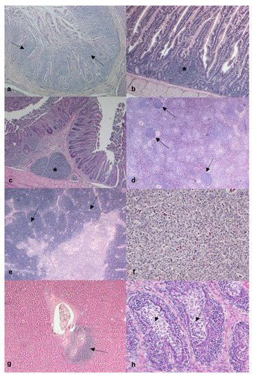 Main histopathological findings in the organs of the broiler chickens (n = 15/treatment). (a) Glandular stomach, mild lymphoplasmacytic infiltrates (black arrows), 5×, hematoxylin and eosin (HE). (b) Duodenum, mild lymphoplasmacytic infiltrates with lymphoid tissue hyperplasia (black asterisk), 5×, H-e. (c) Caecum, mild lymphoid tissue hyperplasia (black asterisk), 5×, H-e. (d) Mild white pulp hyperplasia (black arrows), 5×, H-e. (e) Thymus, mild cortical depletion (black arrows), 5×, H-e. (f) Liver, mild and multifocal vacuolar degeneration of the hepatocytes, 20×, H-e. (g) Liver, mild lymphoplasmacytic infiltrates (black arrow), 5×, H-e. (h) Bursa of Fabricius, mild follicular depletion (black arrows), 5×, H-e.