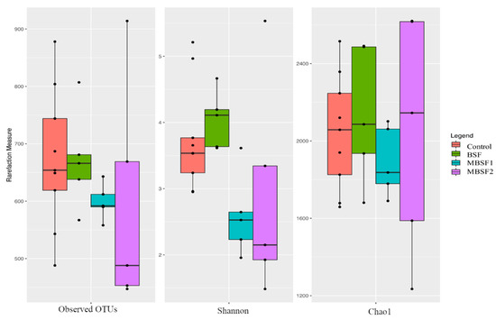 Boxplots to describe α-diversity measures of fecal microbiota of broiler chickens at the end of the experimental trial. BSF = diet with black soldier fly larvae fat; MBSF1 = diet with modified black soldier fly larvae fat type 1; MBSF2 = diet with modified black soldier fly larvae fat type 2.