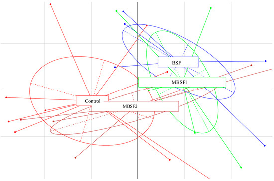 Principal component analysis (PCA) based on OTUs relative abundance of broiler chickens at the end of the experimental trial. BSF = diet with black soldier fly larvae fat; MBSF1 = diet with modified black soldier fly larvae fat type 1; MBSF2 = diet with modified black soldier fly larvae fat type 2.