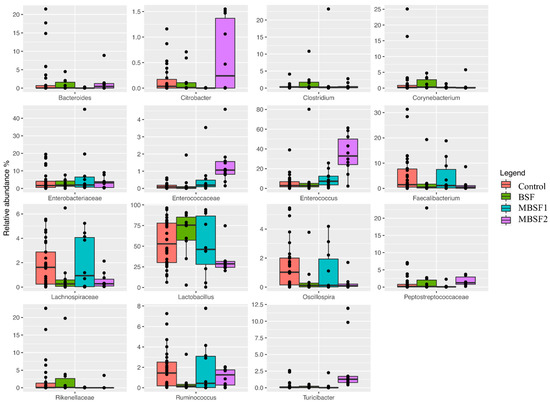 Boxplots showing the relative abundance at genus or family level of the OTUs differentially abundant based on generalized linear mix model (p ≤ 0.05) in fecal samples of broiler chickens independently of sampling time. BSF = diet with black soldier fly larvae fat; MBSF1 = diet with modified black soldier fly larvae fat type 1; MBSF2 = diet with modified black soldier fly larvae fat type 2.